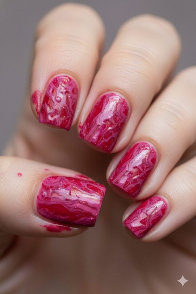 This technique lifts some of the wet red polish, revealing the lighter pink underneath in a cool, organic pattern. It creates a textured look that resembles crushed velvet or expensive marble stone.